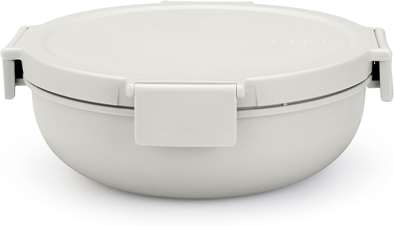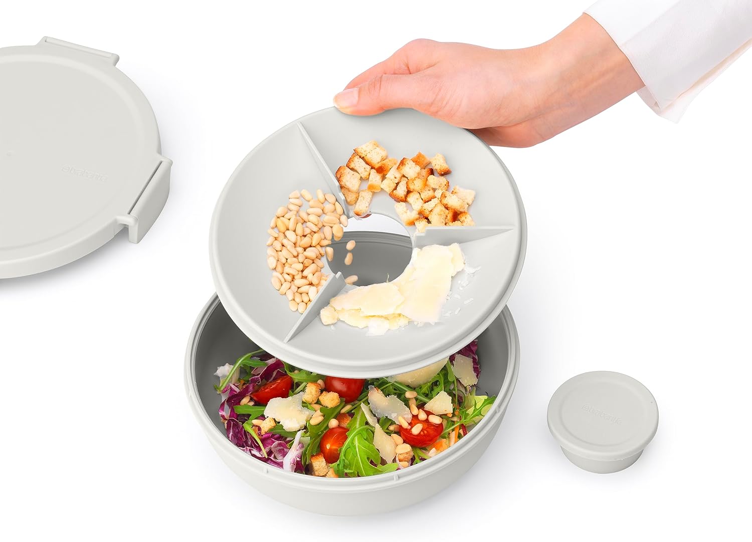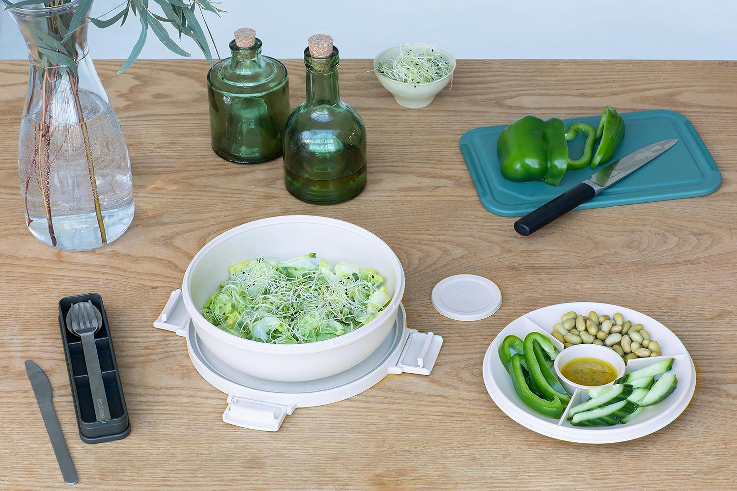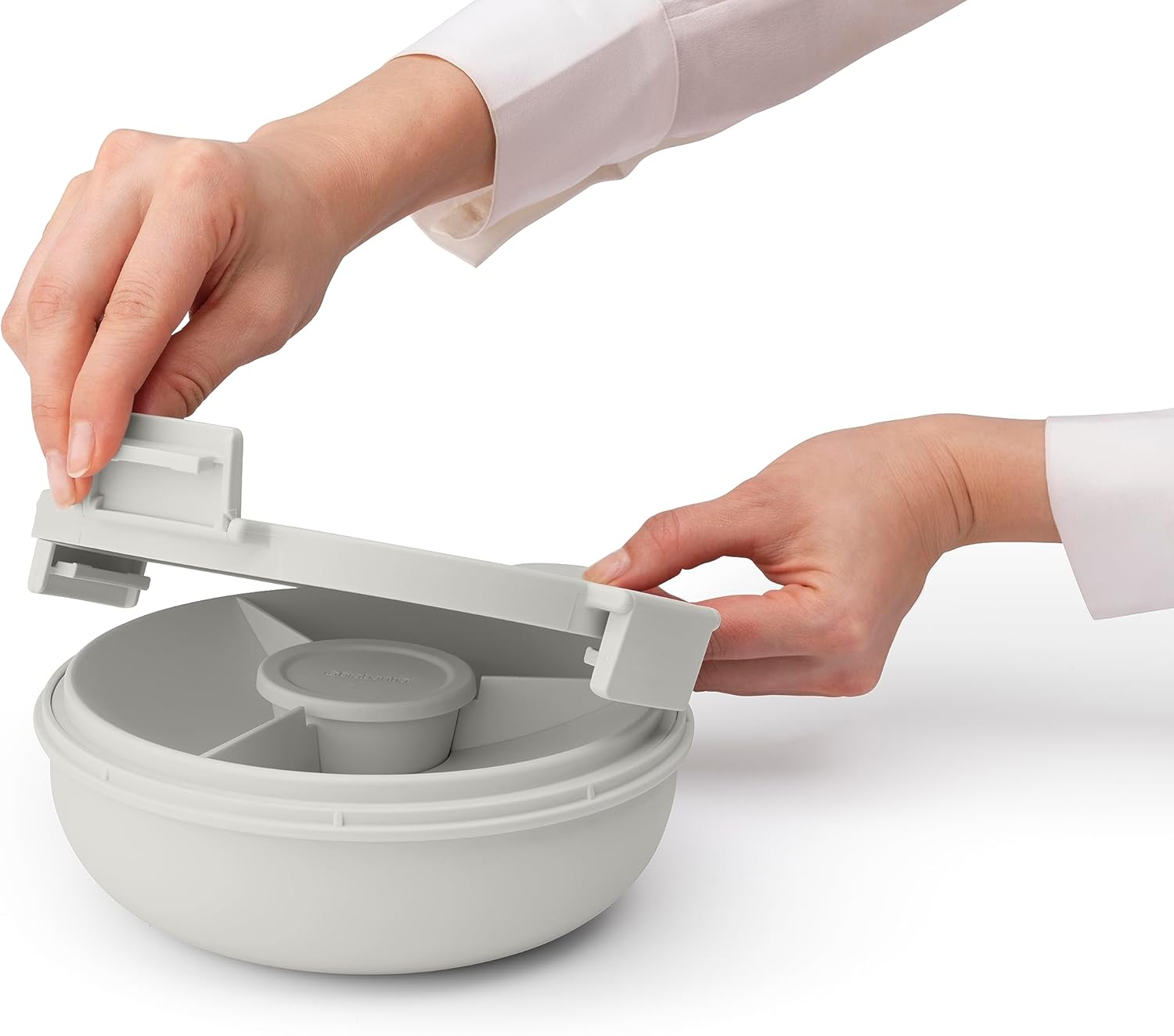 Com a Saladeira Brabantia Make & Take de 1,3L, preparar e levar uma salada para o almoço é fácil e divertido. Esta super saladeira possui um compartimento interior para os ingredientes e um recipiente para o molho que também funciona como tampa. Basta puxar o recipiente e agitar ligeiramente a saladeira para distribuir os ingredientes, juntar o molho e está pronto! Para saladas incríveis.