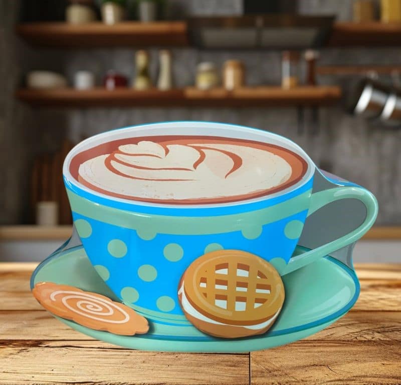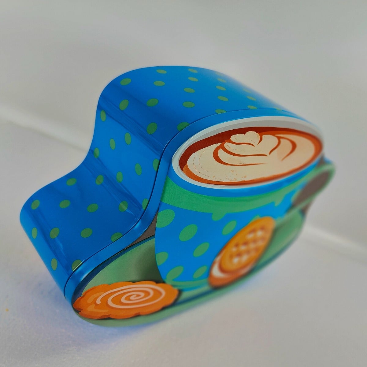 Lata de bolachas divertida e diferente, com um design de chávena de café turquesa com pires por baixo, além de espaço para algumas bolachas.